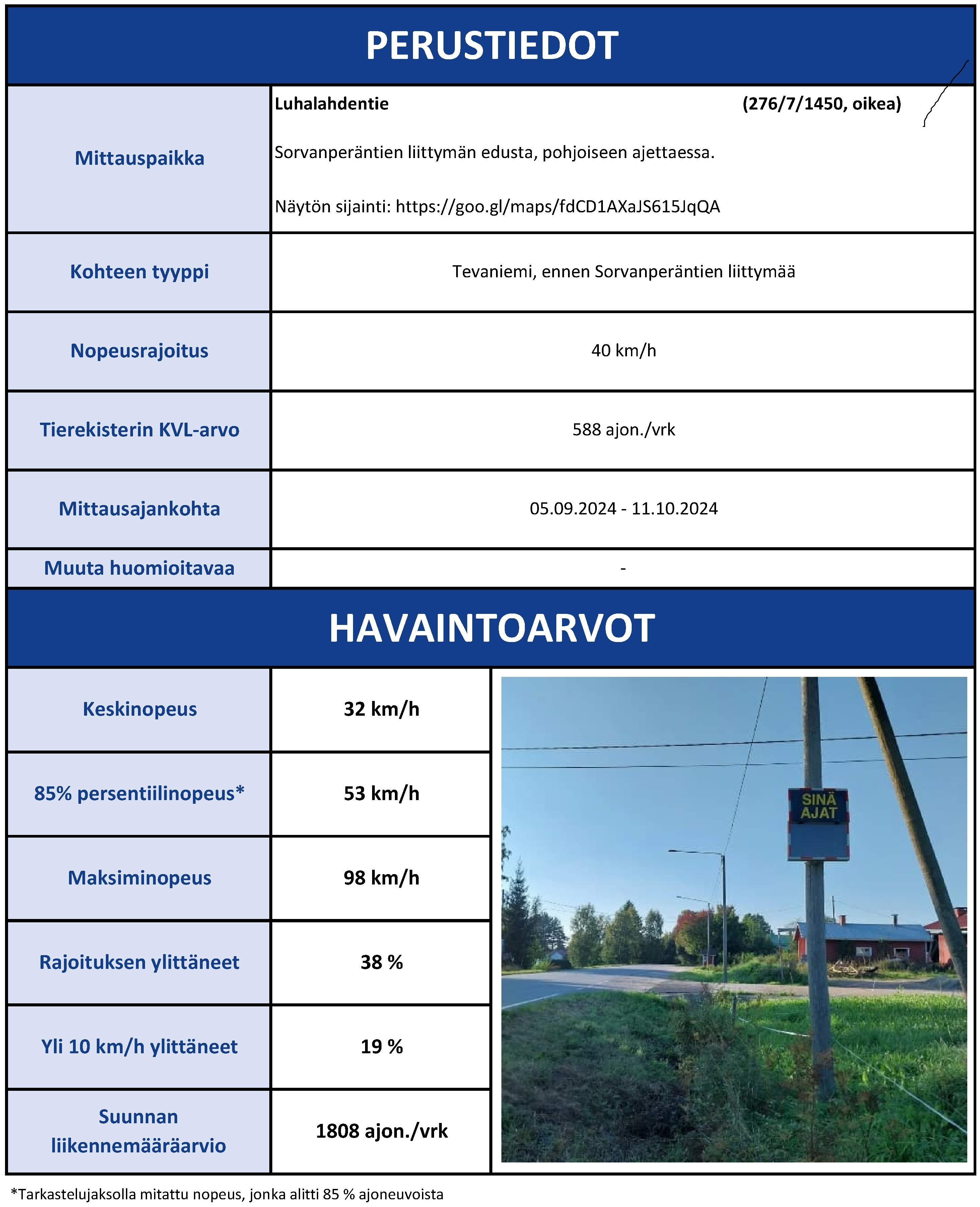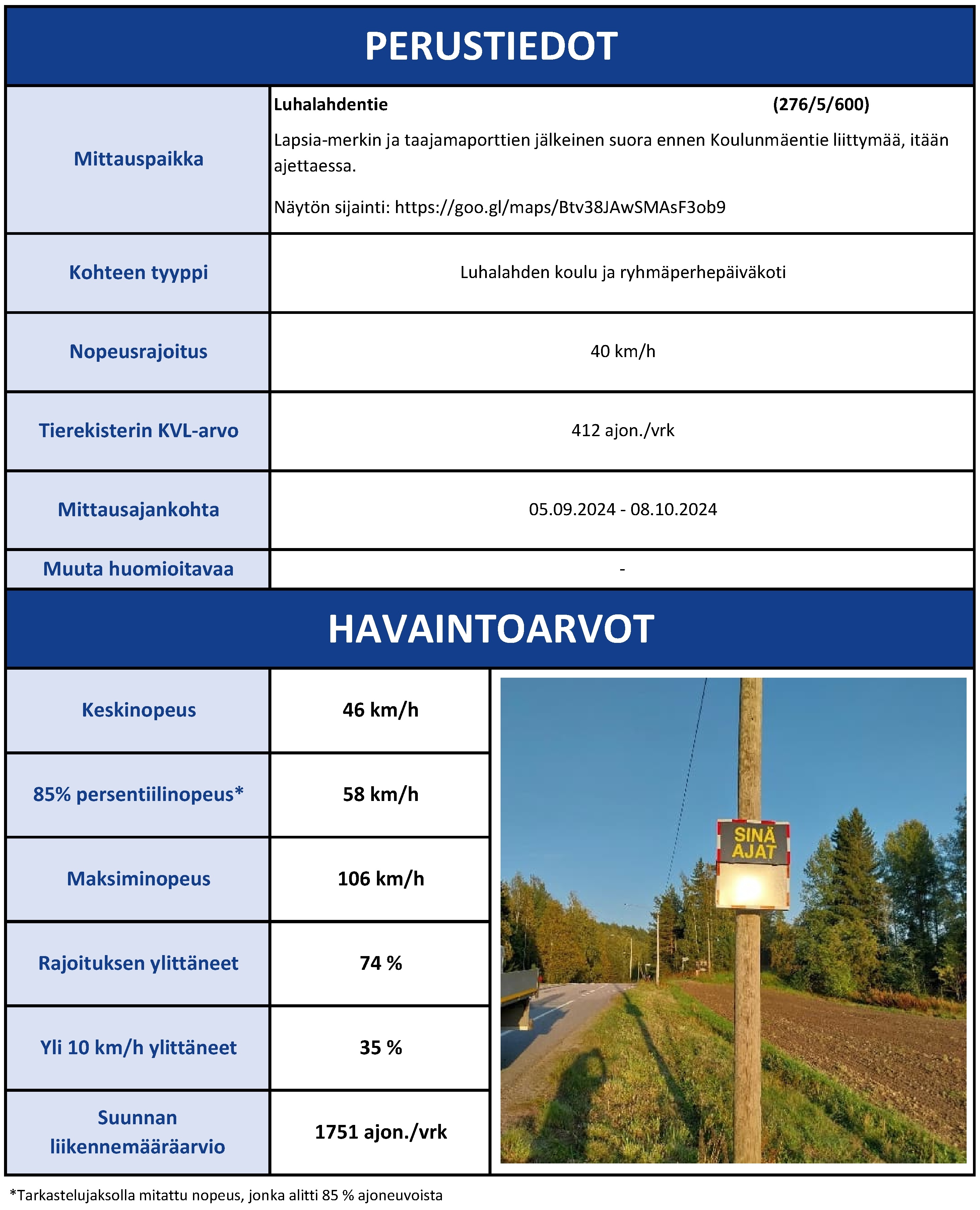Esimerkiksi Luhalahdentien mittauspisteellä, Luhalahden koulun kohdalla, 74 % autoilijoista ylitti nopeusrajoituksen, ja 35 % ajoi yli 10 km/h ylinopeutta. Suurin mitattu nopeus oli peräti 106 km/h alueella, jossa rajoitus on 40 km/h.