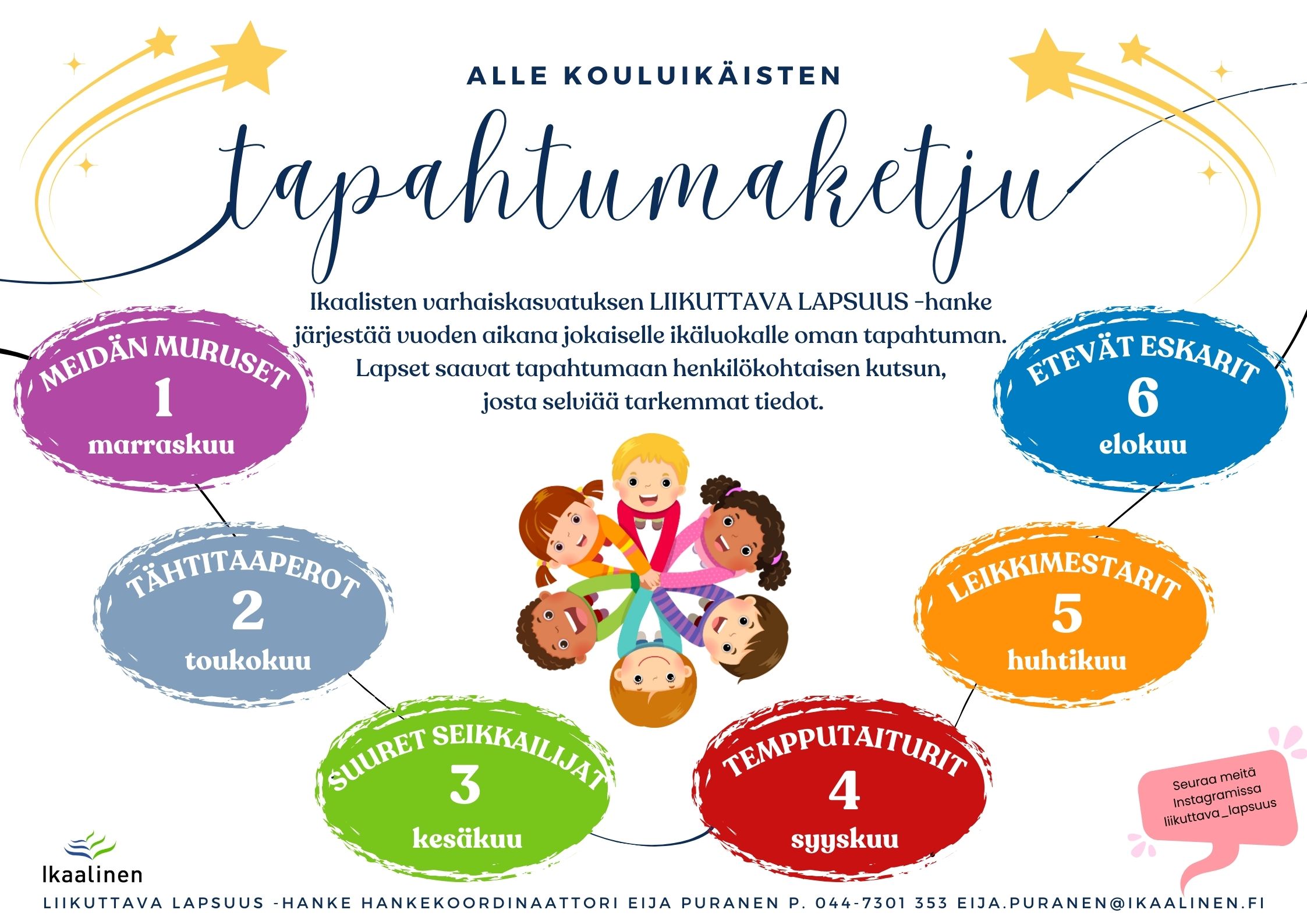 Perheliikunnasta ja perheliikuntaneuvonnasta voi kysyä lisätietoja varhaiskasvatuksen liikunnanohjaajalta Roosa Ravantti p. 044-7306 459 tai hankekoordinaattorilta Eija Puranen p.044-7301 353.