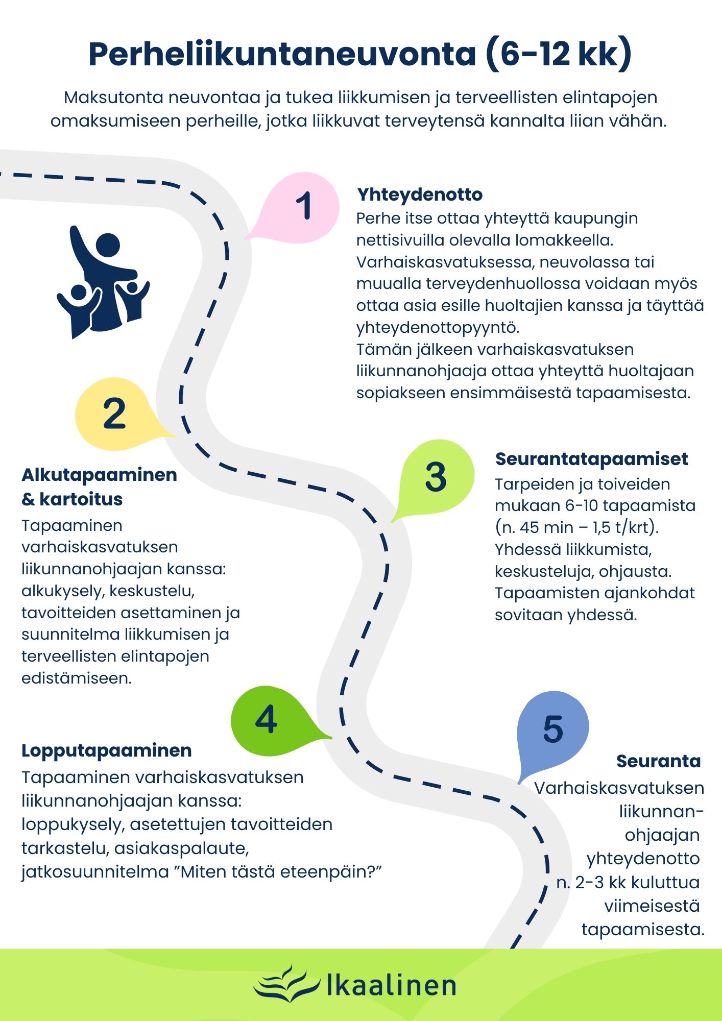 Perheliikuntaneuvonta on maksuton palvelu lapsiperheille, jotka kaipaavat tukea perheen yhteisen liikkumistavan tai harrastuksen etsimiseen, terveellisempien elintapojen omaksumiseen ja kokonaisvaltaiseen hyvinvointiin. Varhaiskasvatuksen liikunnanohjaaja on kanssakulkijana ja hyvinvoinnin tukijana mukana perheen liikkuvan elämäntavan polulla.