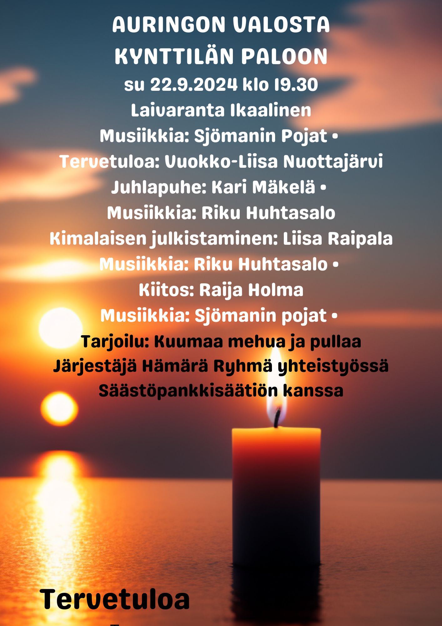 Sunnuntaina 22.9.2024 kokoonnumme jälleen Laivarannassa jättämään jäähyväiset Kesän Auringon Valolle sekä toivottamaan tervetulleeksi syksyn tunnelmalliseen Kynttilän paloon. Tämä upea tapahtuma on Raija Holman ideoima ja järjestetään 25. kerran. Siellä julkistetaan Ikaalisten 2024 vuoden Kimalainen.