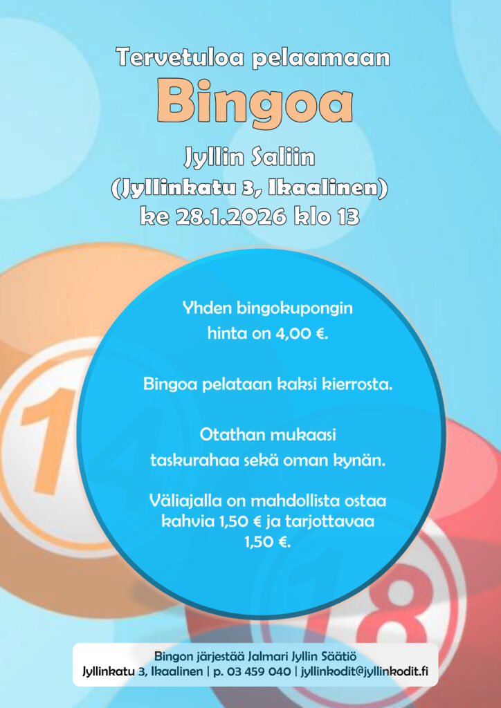 Tervetuloa Jalmari Jyllin Säätiön järjestämään bingoon! Pelaamme kaksi kierrosta, yhden bingokupongin hinta 4,00 e. Väliajalla on mahdollista ostaa kahvia 1,5o e hintaan ja kastettavaa 1,50 e hintaan.