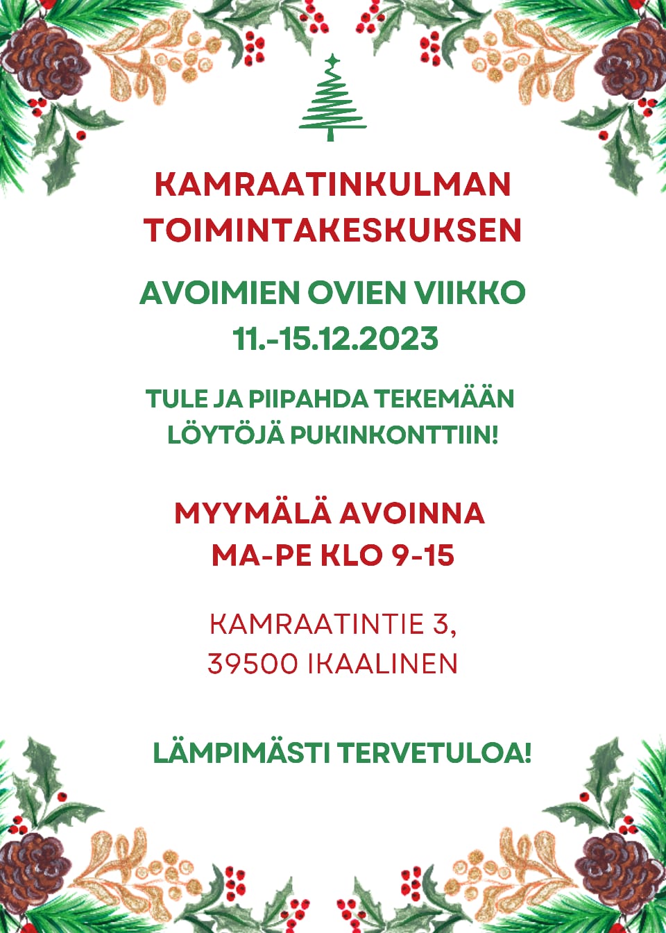 Kamraatinkulman toimintakeskuksen avoimien ovien viikko 11.-15.12.2023 klo 9-15