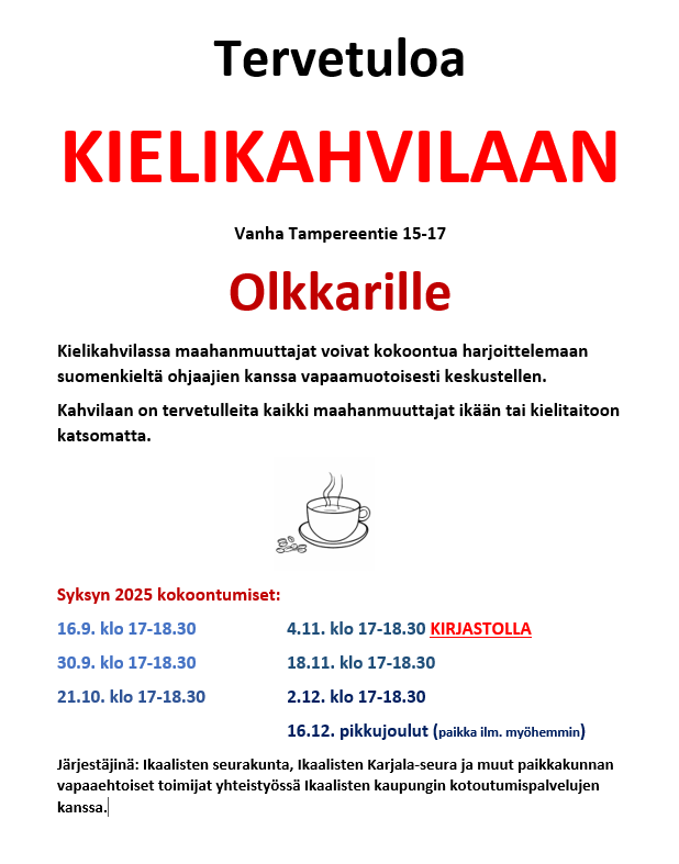 Tervetuloa Kielikahvilaan Olkkarille! Kahvila on suunniteltu maahamuuttajien kohtaamispaikaksi, jossa opetellaan suomen kieltä kevyen keskustelun parissa. Syksyn aikataulu on ohessa. Toimintaa ja keskustelua ohjaavat selkosuomeen perehtyneet vapaaehtoiset ohjaajat.