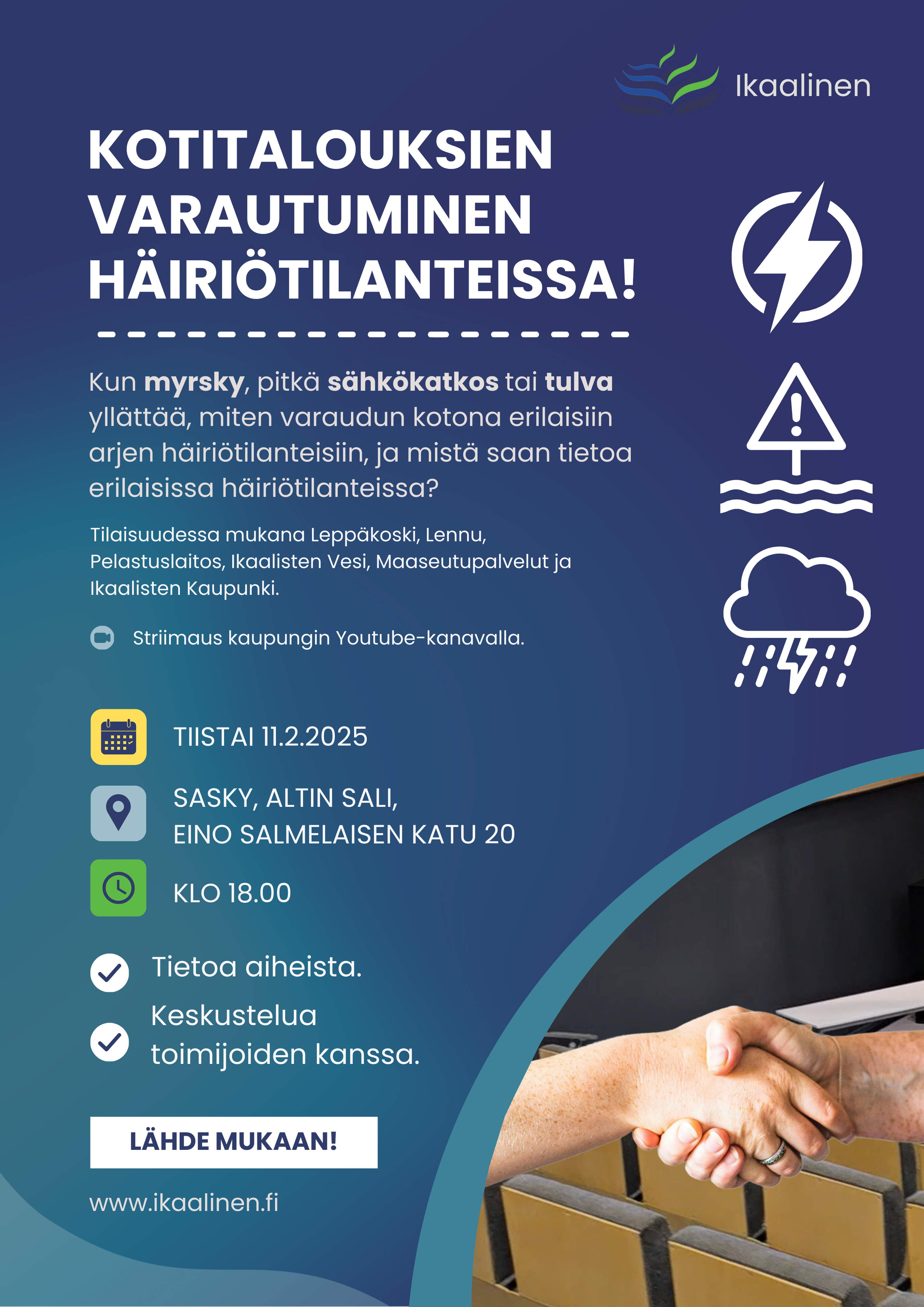 Saat vastauksia näihin kysymyksiin ”Kotitalouksien varautuminen häiriötilanteissa!” tilaisuudessa tiistaina klo 18.00 11.2.25 Saskyn Altin Salilla, osoitteessa Eino Salmelaisenkatu 20. Tilaisuudessa ovat mukana Leppäkoski, Lennu, Pelastuslaitos, Ikaalisten Vesi, Maaseutupalvelut ja Ikaalisten Kaupunki. Saat paikan päällä tietoa ja voit keskustella Ikaalisten toimijoiden kanssa.