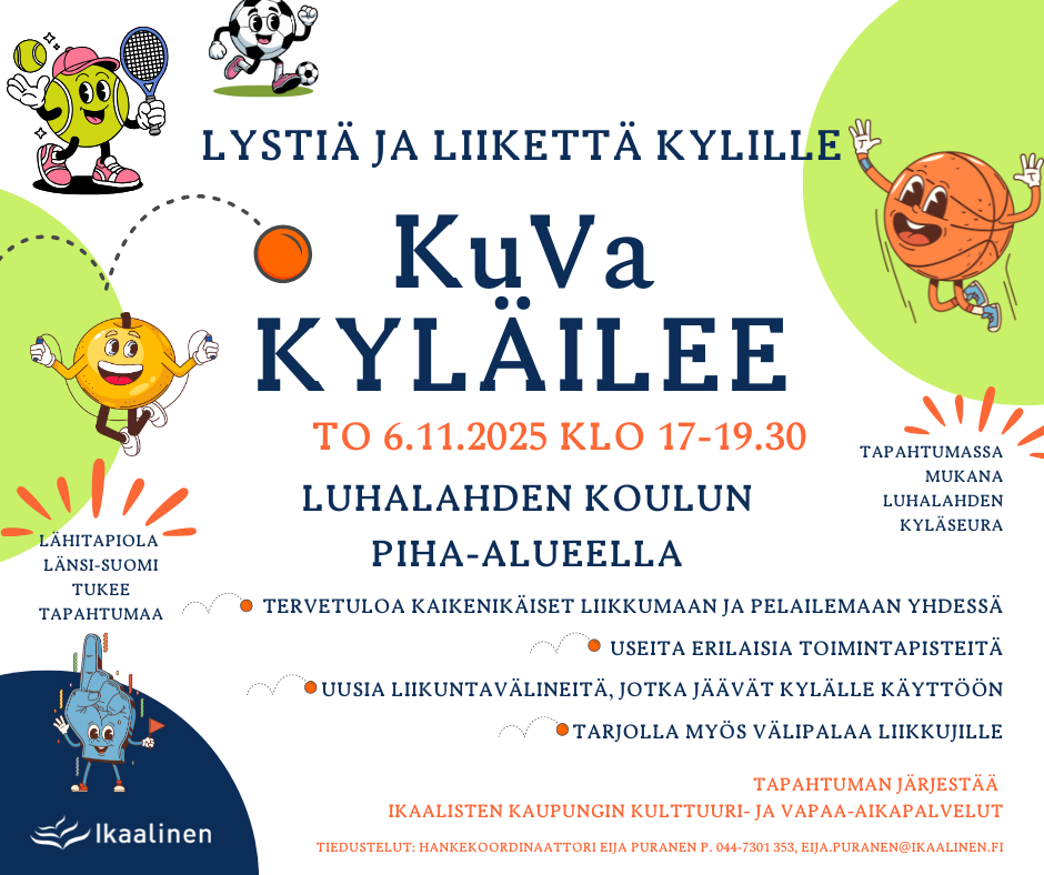 Tervetuloa kaikenikäiset liikkumaan ja pelailemaan yhdessä. Tapahtumassa on useita erilaisia toimintapisteitä sekä uusia liikuntavälineitä, jotka jäävät kylälle käyttöön. Liikkujille on myös tarjolla pientä välipalaa. Pukeudu säänmukaisesti, sillä tapahtuma järjestetään ulkona (myös sateella -rohkeasti mukaan)!