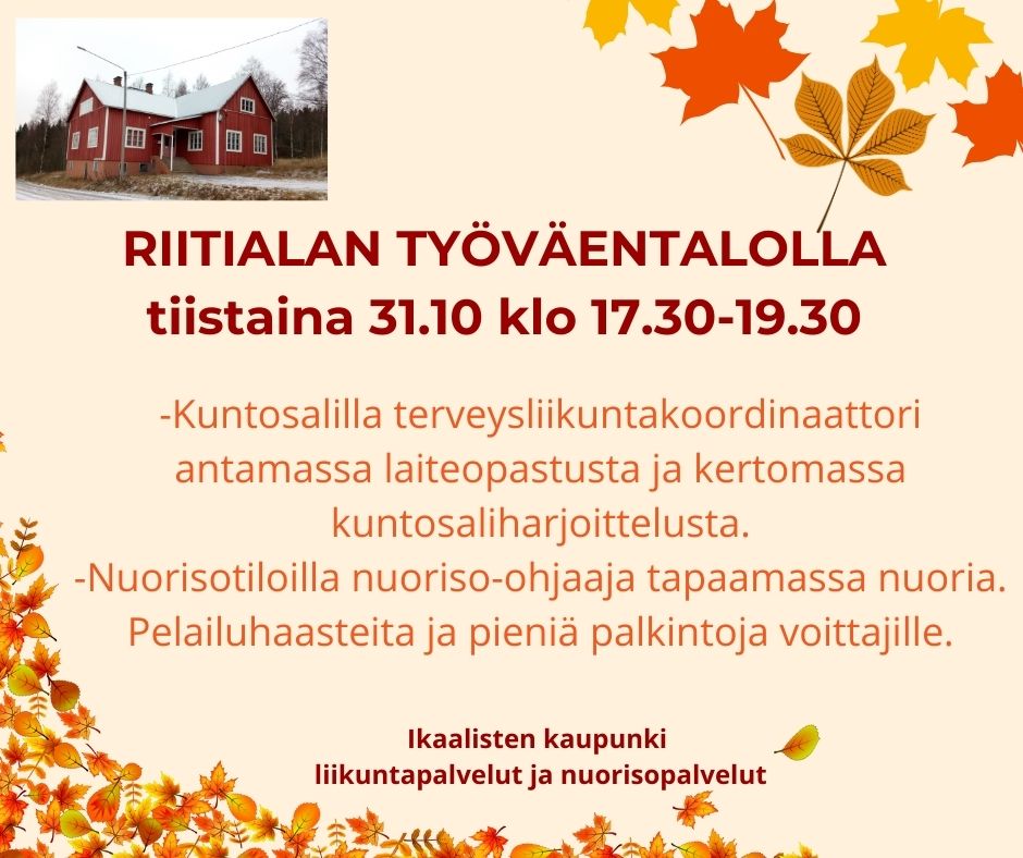 Liikuntakoordinaattori Riitialan työväentalolla ti 31.10. klo 17.30-19.30