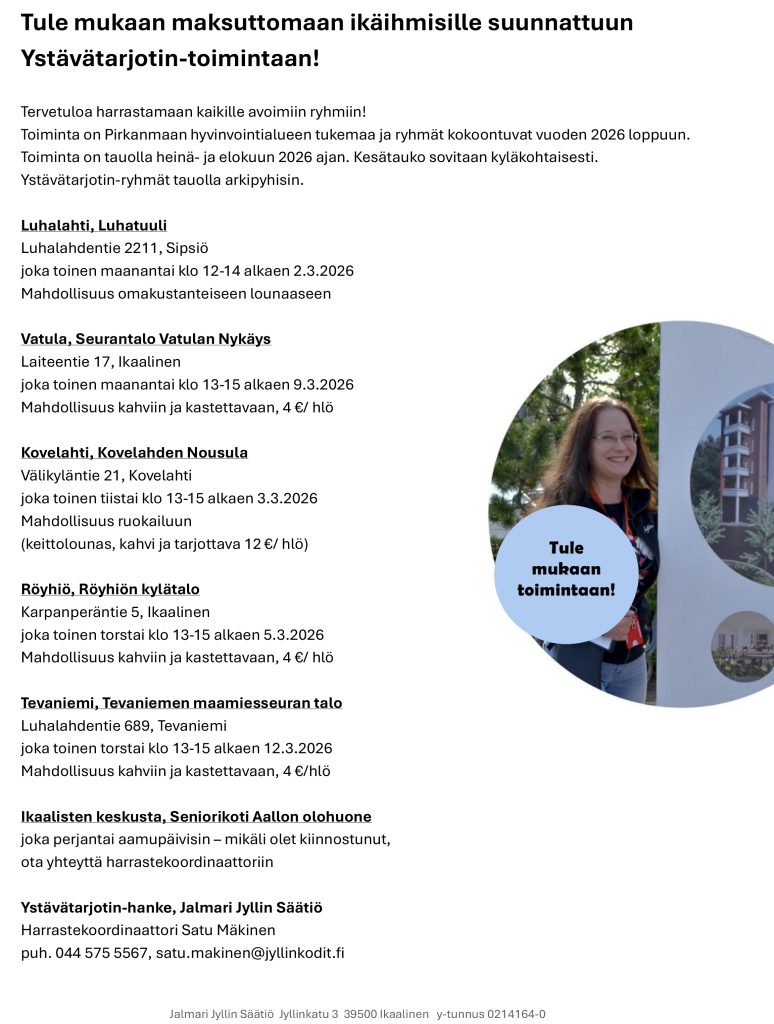 Kokoonnumme Vatulassa (Seurantalo Vatulan Nykäys, Laiteentie 17, Ikaalinen) joka toinen maanantai klo 13-15 alkaen 9.3.3026.