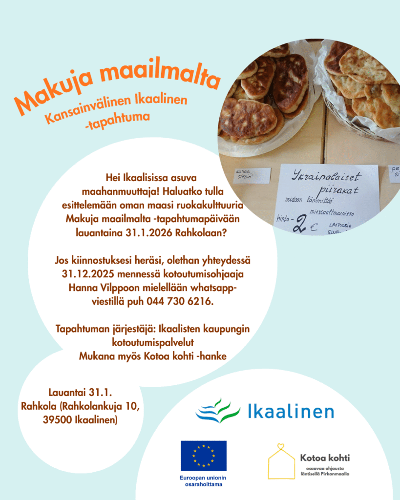 Etsimme kansainväliseen ruokatapahtumaamme maahanmuuttajia, jotka haluaisivat tulla valmistamaan ryhmämme kanssa oman kulttuurinsa mukaisia maistiaisia ikaalilaisille. Tapahtuma järjestetään Rahkolassa lauantaina 31.1.2026.