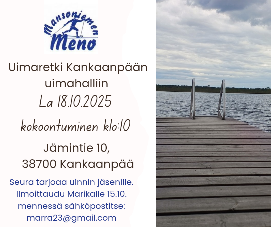 Saapuminen omilla kyydeillä. Seura maksaa jäsenien uinnin, muille omakustanteinen. Kokoontuminen Kankaanpään uimahallin edustalla klo10. Ilmoittautuminen 15.10. mennessä sähköpostilla marra23@gmail.com.